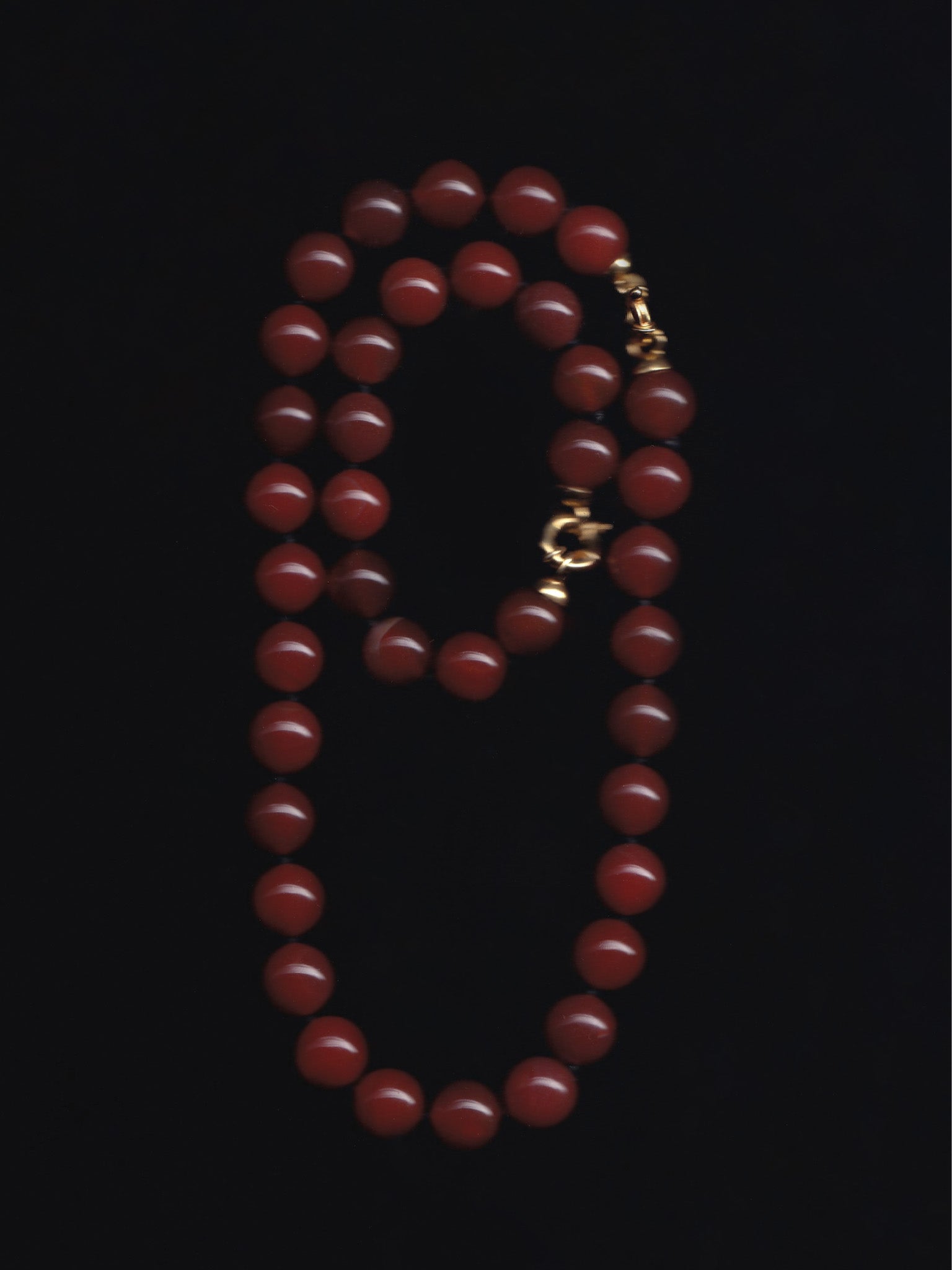 Ein Strang aus feurigem Karneol – leuchtend in Orange- und Rottönen. Jeder Stein trägt Wärme und Vitalität in sich, ein leiser Rhythmus von Mut und Kreativität. Die polierte Oberfläche fängt das Licht mit sanftem Schimmer – das Armband wirkt erdend und strahlend zugleich.