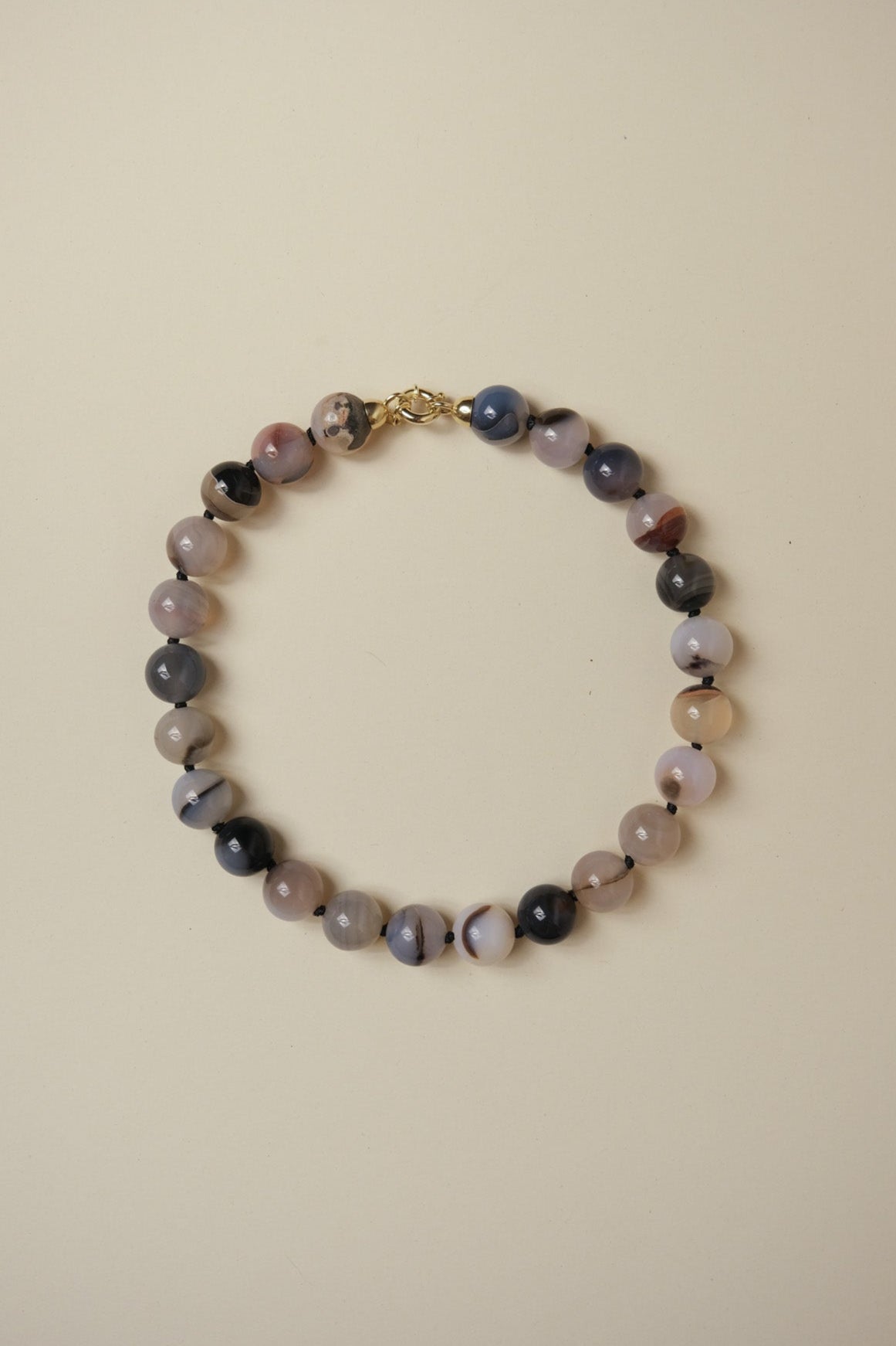 Chloe ist gefertigt aus durchscheinenden Achatperlen – jede einzelne mit einem feinen Farbspiel aus Grau, Beige, Weiß oder rötlichen Tönen. Kein Stück gleicht dem anderen – jede Kette trägt ihre eigene leise Variation.