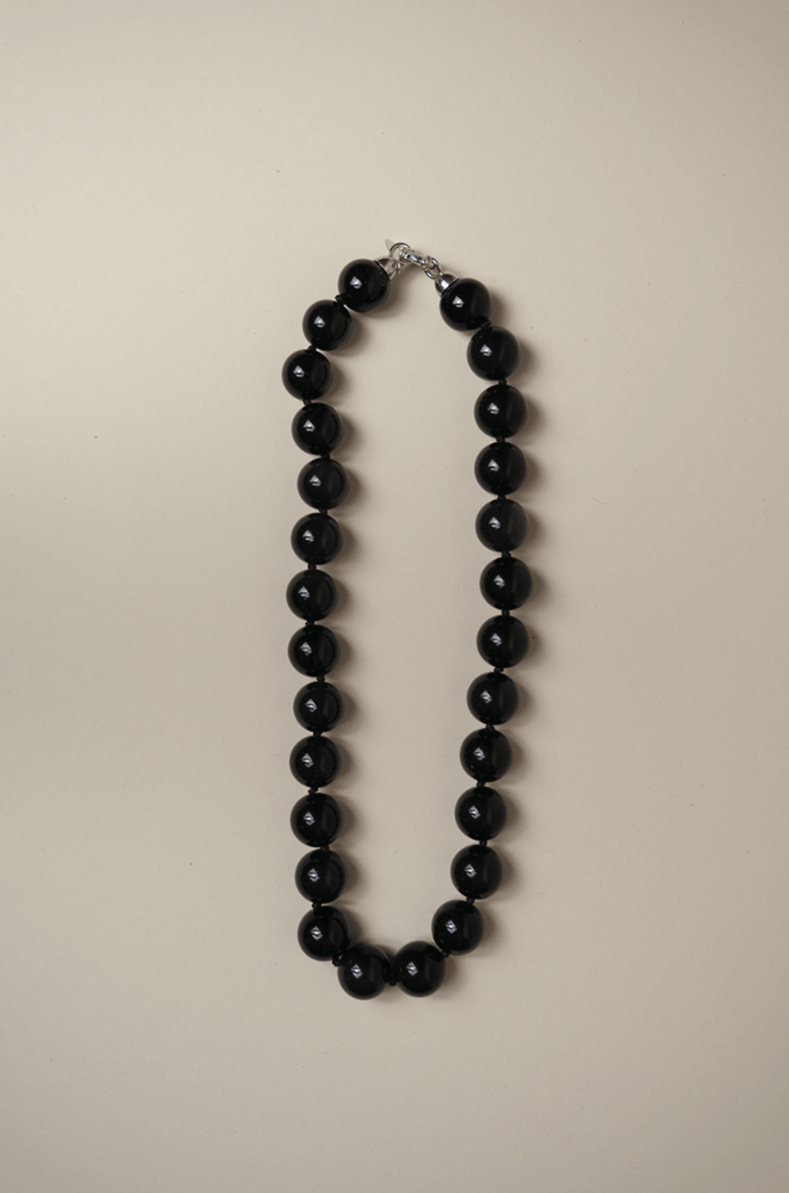 Große, polierte Obsidianperlen fangen das Licht mit glasiger, tiefschwarzer Brillanz – ein Fragment aus Eleganz und Schutz.