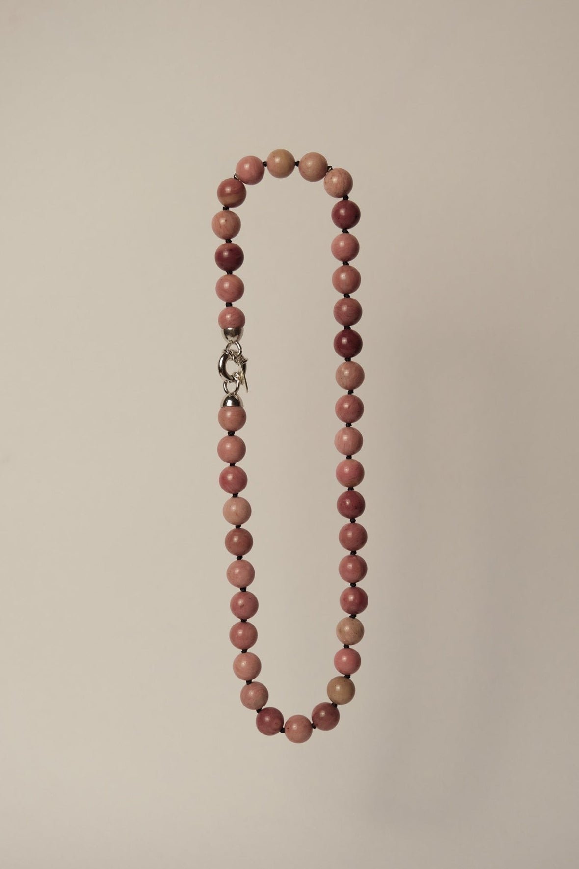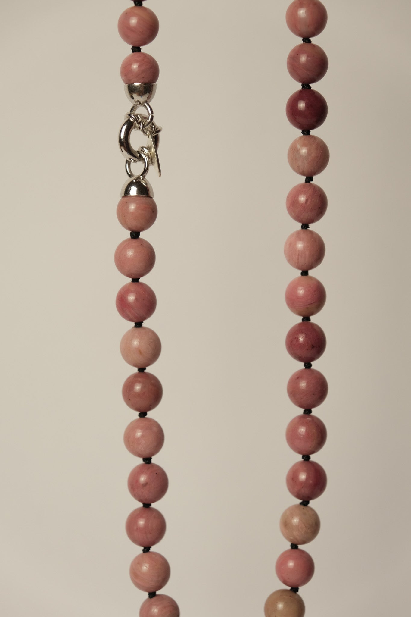 Gefertigt aus sanft gemasertem Rhodonit, bewegt sich diese Kette zwischen Zartheit und Kraft. Mit 45 cm Länge liegt sie ruhig am Schlüsselbein, gehalten von einem Verschluss aus Sterlingsilber.
