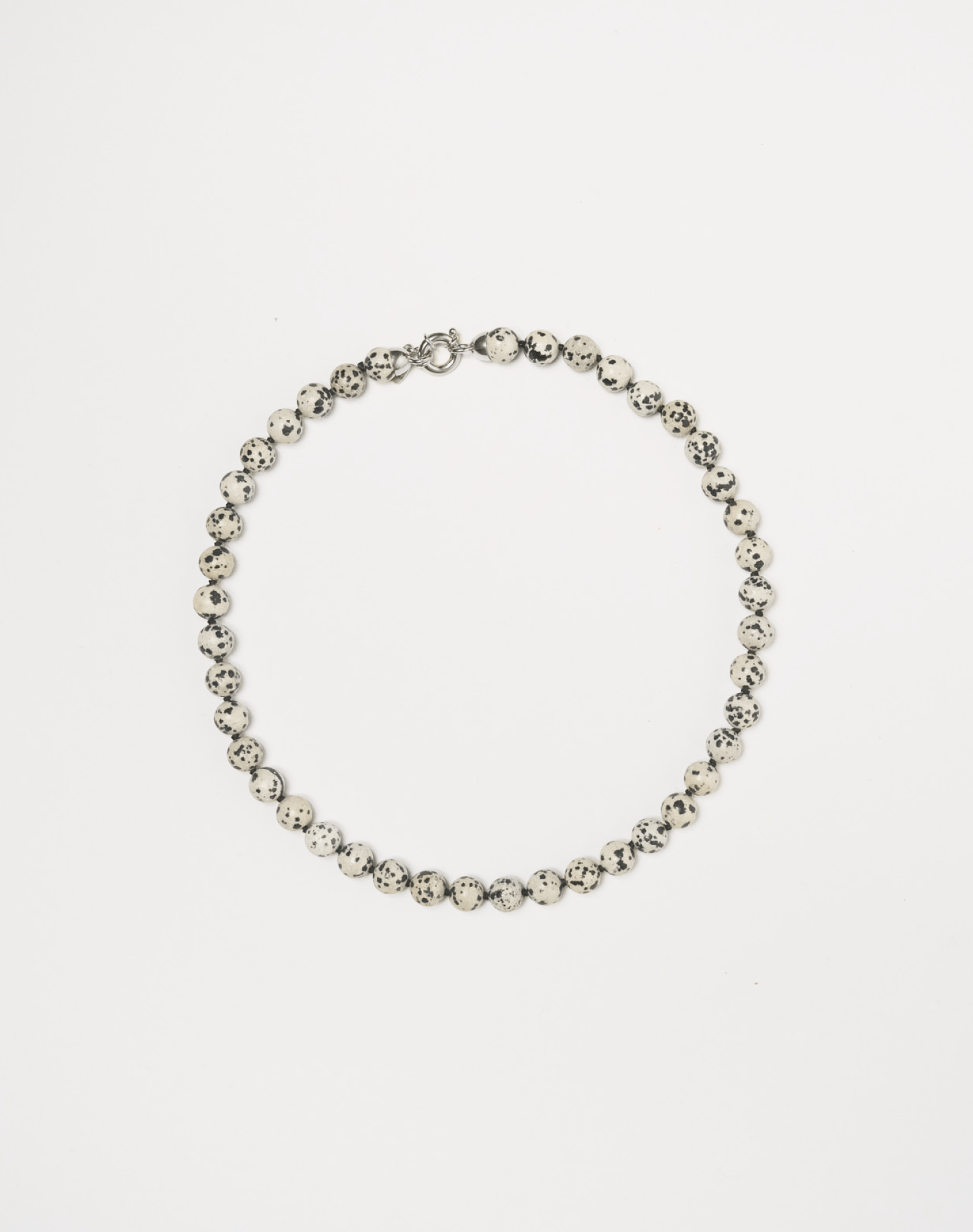 LEO - our unique Dalmatian Stone Necklace, featuring natural beads with eye-catching black spots on a creamy white base, reminiscent of the beloved Dalmatian pattern. Each stone is carefully polished to reveal its fun and distinctive look, adding a touch of charm and character to any outfit. Known for inspiring joy and a sense of adventure, Dalmatian stone brings playful energy into your style.
