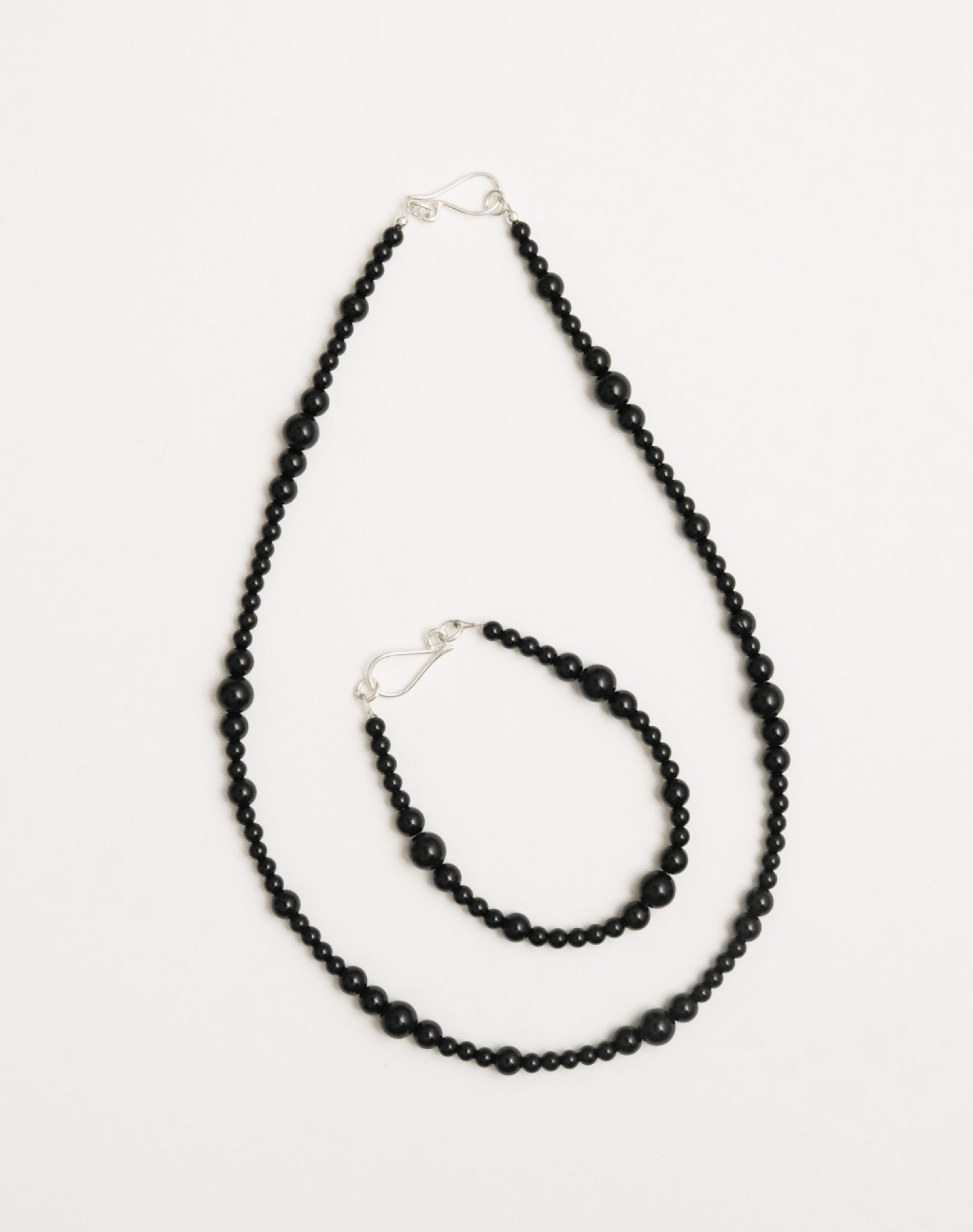 A refined bracelet of polished black onyx beads in graduated sizes, designed for balance and depth. It combines glossy intensity with minimalist elegance. Finished with a sterling silver clasp for a secure, timeless touch. Versatile enough to wear alone or layered, it transitions effortlessly from day to evening.